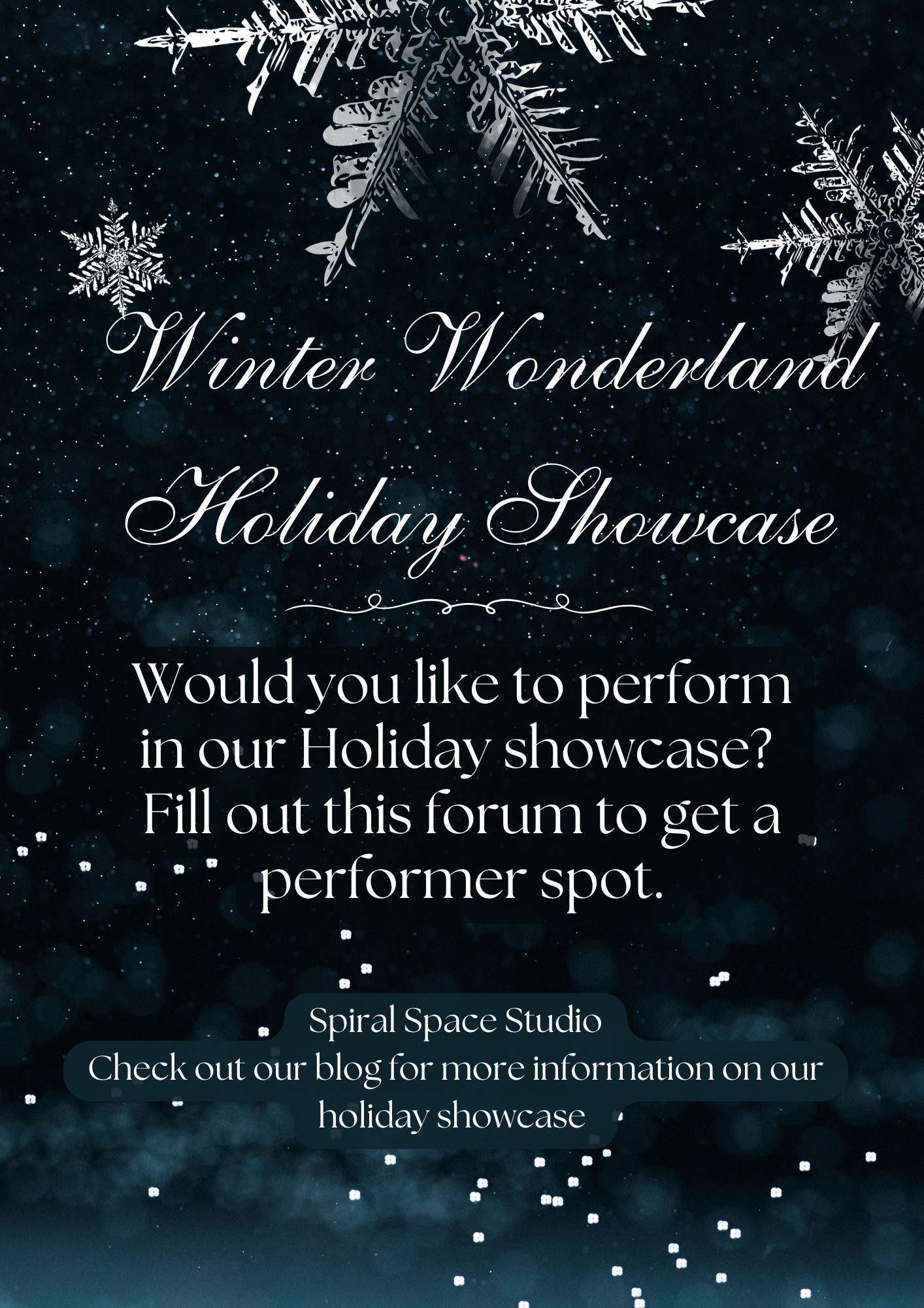Hey there, fabulous folks! Ready to heat up your winter season with some dazzling performances? Spiral Space is calling all performers, from solo stars to group class groovers, to light up our Winter Wonderland themed showcase this December! We are excited to be putting on our first student & teacher showcase. 🌟